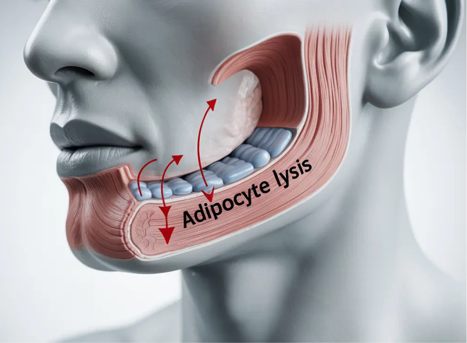 Kybella works by dissolving the fat cells in the submental area which is under the chin. As the cells break apart, your body drains them through the lymphatic system. Deoxycholic acid is a concentrated active ingredient dispersed under your chin.